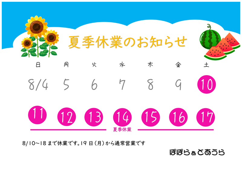 夏季休暇のお知らせ 2024年8月6日 最終更新日時 : 2024年8月6日 hapisuma 8月10日~18日まで夏季休暇を頂戴します。 投稿者プロフィール hapisuma 最新の投稿 お知らせ2025.11.0411月の予定 お知らせ2025.10.31 お知らせ2025.08.058月の予定 お知らせ2025.07.027月の予定